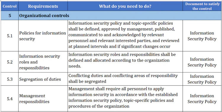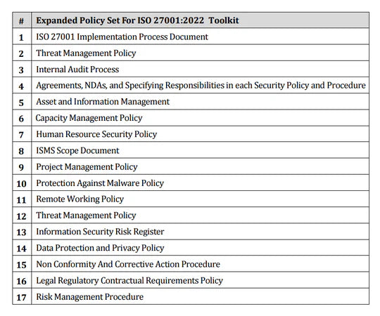 Our implementation plan has a detailed mapping of every ISO 27001 clause and the documentation required for that clause. Our implementation plan also explains which policy should be used for a given clause.