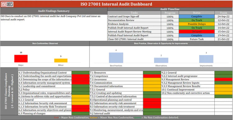 The ISO 27001 Internal Audit Dashboard provides a visual representation of audit activities, compliance status, and corrective actions within an organization's information security management system.